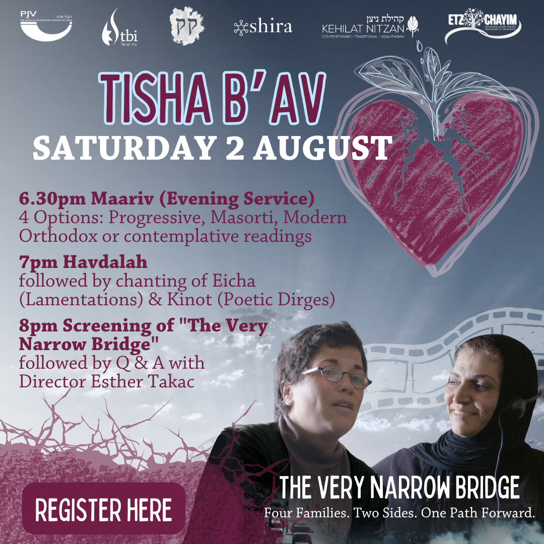 Join Kolenu, along with TBI, Shira Hadasha and Kehilat Nitzan, to mark Tisha B’Av. Join from 6:30pm for Maariv, from 7pm for Havdalah including Eicha and Kinot, and from 8pm for a screening of ‘The Very Narrow Bridge’, documentary by local filmmaker Esther Takac. Register here for an important night of reflection and community.